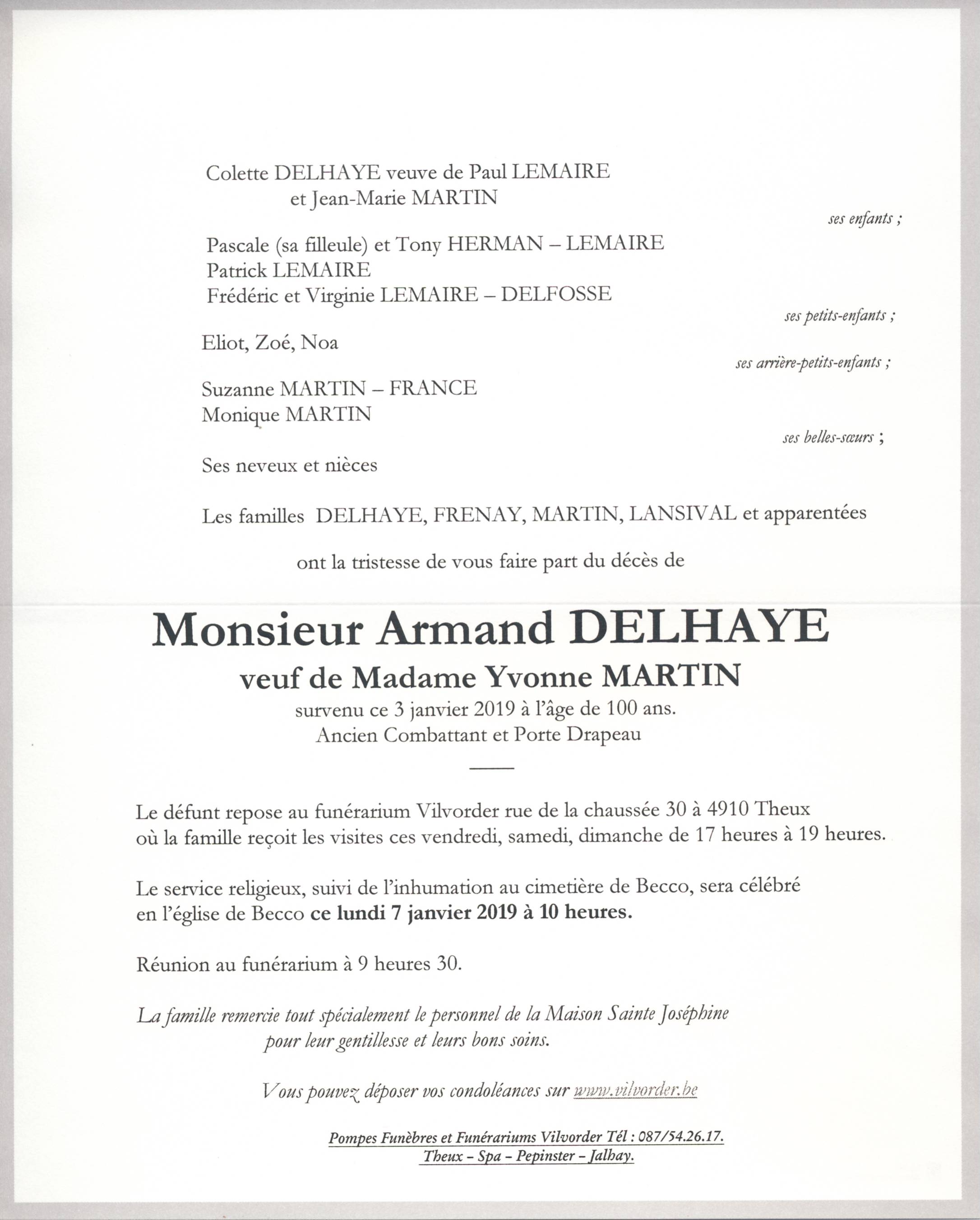 Un ancien du village s’en est allé le 3 janvier dernier : Armand Delhaye, qui avait fêté ses 100 ans il y a quelques mois, s’est éteint à la Maison Sainte-Joséphine à Theux. Il avait auparavant habité des dizaines d’années à Becco, où il a rendu d’innombrables services !
