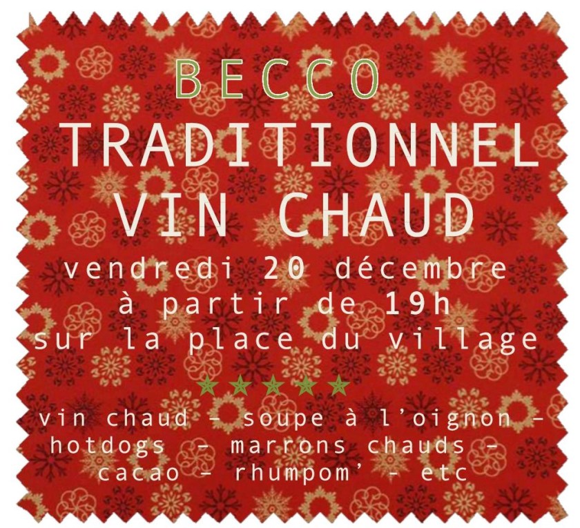 Chers Beccotis, venez partager un bon moment sur la place du village, et déguster : vin chaud, soupe à l’oignon, hotdogs (attention, réservation chez Martine avant le 18 décembre), marrons chauds, cacao, rhumpom’…