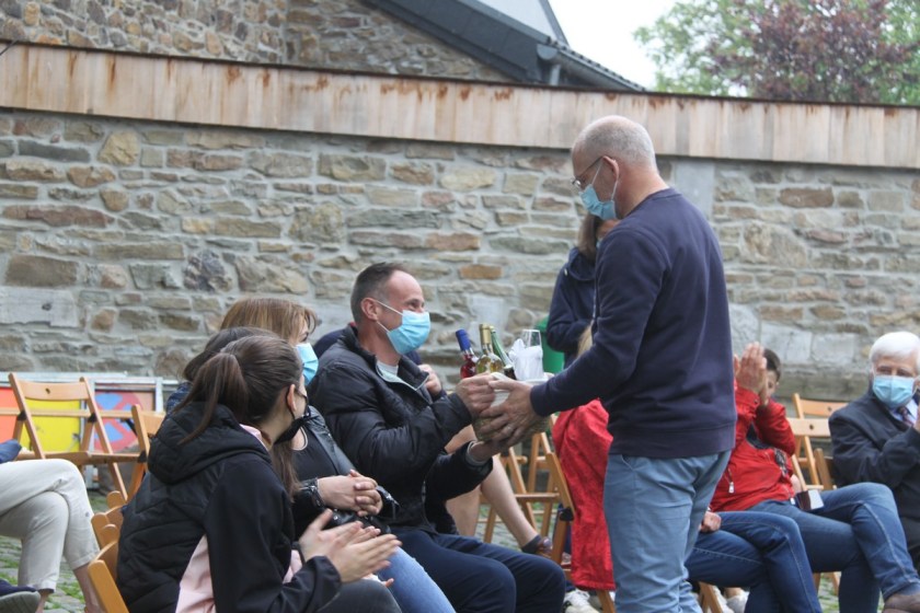 M. Vincent Arroz, responsable de l’entreprise qui a rénové le toit, nous avait fait le grand plaisir de venir de Vielsalm, avec son épouse et ses filles, pour ce moment : le comité des Beccotis lui a offert un panier de « bonnes choses de chez nous » (que lui et ses ouvriers avaient appréciées durant les travaux !).