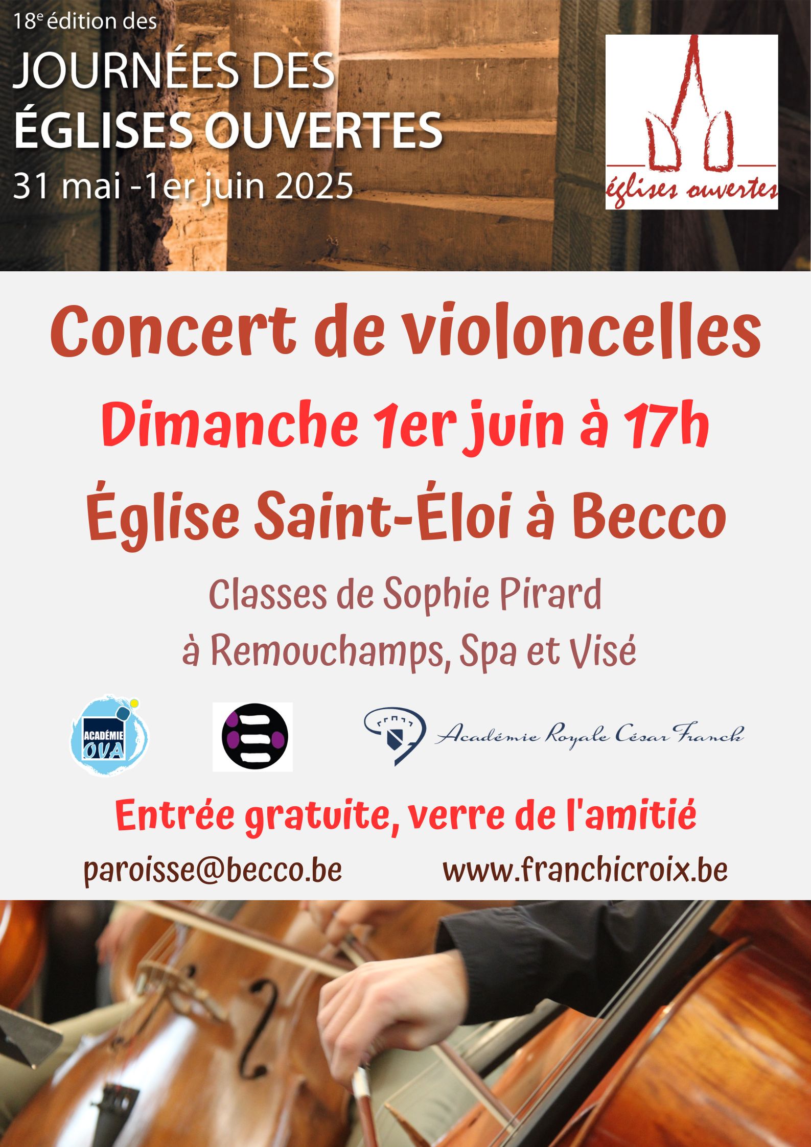 Dans le cadre des Journées des Églises ouvertes, l’église Saint-Éloi de Becco accueillera un concert d’une vingtaine de violoncelles. Ce sera la quatrième édition de ce concert (dont une fois à l’église de La Reid, voir sous l’affiche) qui recueille toujours beaucoup de succès !