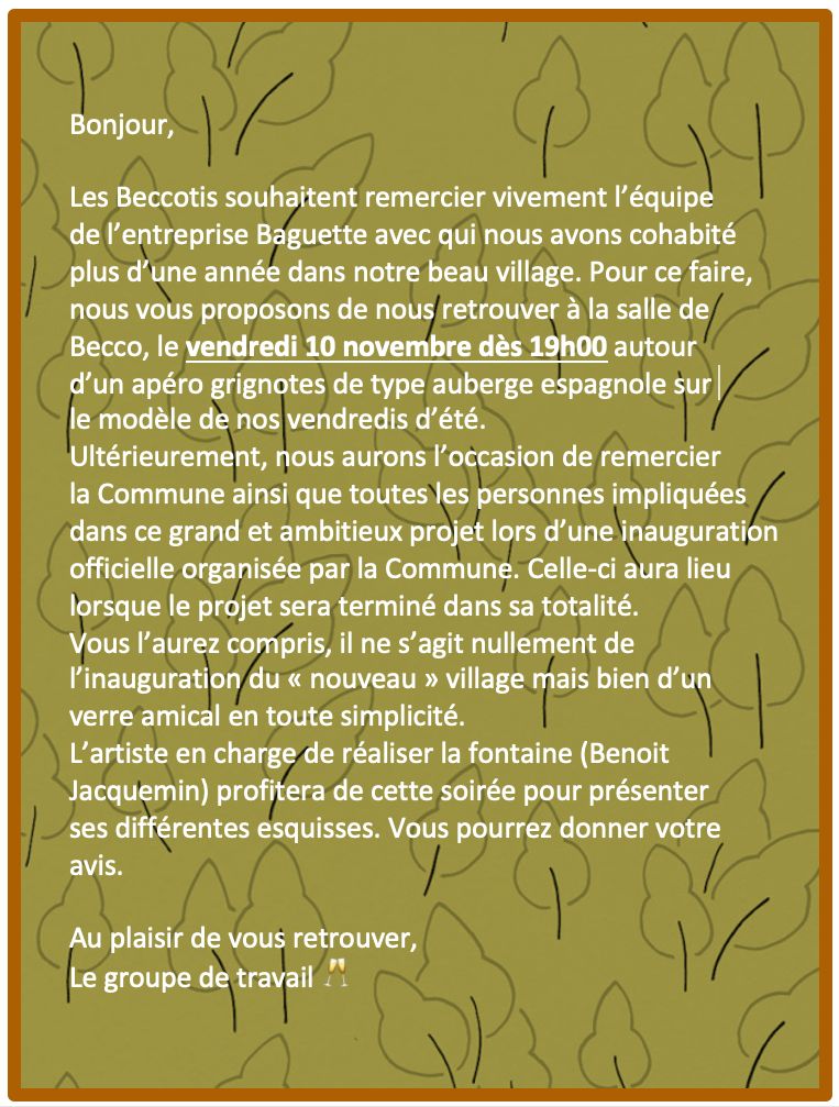 - Wali-Becco 2.0 : Suite aux travaux du village de Becco, le petit bois appelé Wali-Becco, terrain de jeux des enfants, a complètement disparu. A la demande des plus jeunes, les villageois se sont réunis pour réfléchir à l’avenir du site. De ces échanges, un projet écologique, convivial et participatif a vu le jour, favorisant la rencontre autour d’un four à pain, d’une partie de pétanque mais offrant surtout un espace de jeux, de sports et de détente ou simplement un lieu de rencontre intergénérationnel.